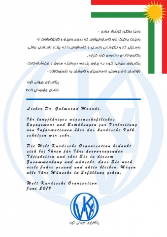 پاشنیوەڕۆی ڕۆژی شەمە ڕیکەوتی ١/٦/٢٠١٩ لە شاری فرانکفۆرتی ئاڵمان، بە نیشانەی ئەمەگداری بۆ زیاتر لە نیو سەدە کار و تێکۆشان لە پێناوخزمەت بە دۆزی کورد دا، لە لایەن رێکخراوی جیهانی کورد،کۆرێکی ڕێزگرتن لە بەڕێز دوکتور گوڵمراد مورادی بەڕێوە چوو.
